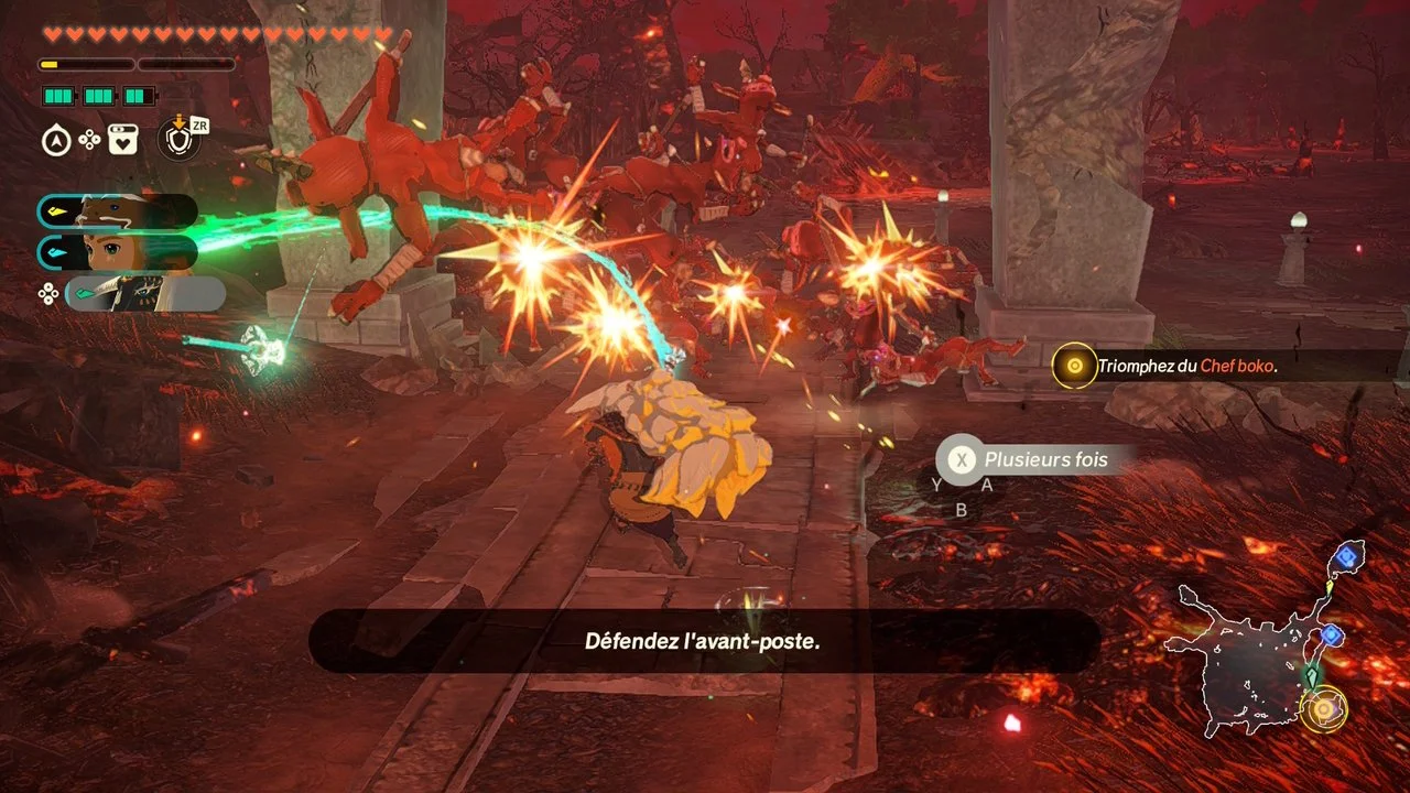 Le nombre d'ennemis présents à l'écran fait aussi un pas en avant pour notre plus grand plaisir. Ce genre de titres sait mettre les machines à rude épreuve tant le nombre d'ennemis affichés va puiser de ressources dans les processeurs. On dénote aussi l'apparition de monstres bien plus balèzes à l'écran qui profitent d'un grand nombre de détails supplémentaires. On apprécie un gain de détails en tout genre comme des ombres plus détaillées, une meilleure distance d'affichage et des textures plus ambitieuses. Le jeu transpose fidèlement l'esthétique cel-shading et les palettes de couleurs de The Legend of Zelda : Tears of the Kingdom, et prend le temps d'intégrer des lieux emblématiques des deux derniers opus de la licence. On va retrouver des environnements variés, incluant des champs de bataille, des châteaux, des zones volcaniques et plus encore. En mode coopération, c’est un peu moins joli au niveau du framerate qui tentera de se stabiliser à 30 images par secondes et la définition baisse également.