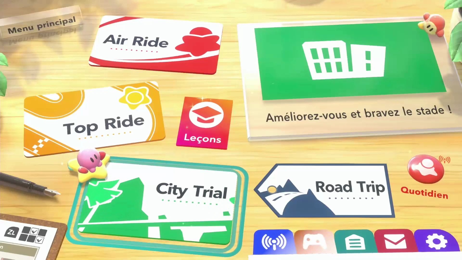 Difficile d'expliquer simplement ce qu'est véritablement Kirby Air Riders tant les modes de jeux existants sont différents. On est principalement sur un jeu de course, mais qui dispose grosso modo d'un mode de combat en arène qui sera le véritable plat de résistance pour les fans du premier jeu et au final quand on fait les comptes on se dit que l'on est sur une sorte de party game à la sauce véhicules de combat qui tire du côté arcade. Les modes de jeux sont assez différents et à chaque fois on a une multitude d'objectifs à remplir pour espérer remporter la victoire. La partie la plus classique de Kirby Air Ride reste les courses classiques dans le mode Air Ride, où chaque véhicule, ainsi que chaque personnage, a des habilités particulières. Dans ce mode de jeu, en fin de compte, la vitesse est reine, même si l'on peut bastonner nos adversaires pendant une course grâce à des pouvoirs. Deux boutons en plus du stick directionnel suffisent à donner de bonnes sensations de jeu et on est surpris de tout ce que l'on peut réaliser avec aussi peu de touches. Kirby Air Riders reste un jeu accessible au premier venu, mais difficile à maîtriser dans tous ses modes de jeu. Le pilotage mise sur une simplicité instinctive : Kirby file de lui-même, et le stick sert de volant pour orienter son bolide. Tout repose sur la gestion de l’inertie. En virage, on maintient le bouton principal pour amorcer un dérapage et accumuler de l'énergie, avant de la libérer en un boost explosif à la sortie. Même dans les airs, le contrôle reste total : ajuster sa trajectoire pour un atterrissage parfait garantit un gain de vitesse immédiat. Qu’il s’agisse de frôler un ennemi ou de traverser un anneau, chaque interaction devient un moteur d'accélération. Quant aux pouvoirs, ils se déclenchent d'une simple pression pour dynamiser la course sans jamais briser l'élan. Un gameplay tout en douceur où chaque mouvement précis se transforme en pure vitesse. Comme dit un peu plus haut L'accessibilité reste l'une des forces du jeu de Monsieur Sakurai. Impossible de tomber dans le vide par exemple ou bien de rester coincé dans une course, ce qui pourra aider les moins habitués à tenter l'expérience. Le mode Top Ride, quant à lui, permet de faire la même chose, mais sur des pistes vues de haut qui rappellent fortement les jeux Micro Machines de l'époque PS1, mais en bien meilleur. Le mode City Trial quant à lui est celui qui plaira selon nous le plus aux fans de jeux en ligne. Ce dernier est un mode qui nous parachute dans la cité de Skaïa pour une phase de préparation frénétique. Le concept est simple mais redoutable : vous avez 5 minutes pour explorer la ville, dénicher des zones secrètes et accumuler un maximum de bonus pour booster les statistiques de votre machine. Ici, la préparation est le nerf de la guerre : une épreuve finale, tirée au sort parmi une sélection variée comme des courses, des combats d’arène, de survie et plus encore, viendra tester votre efficacité.