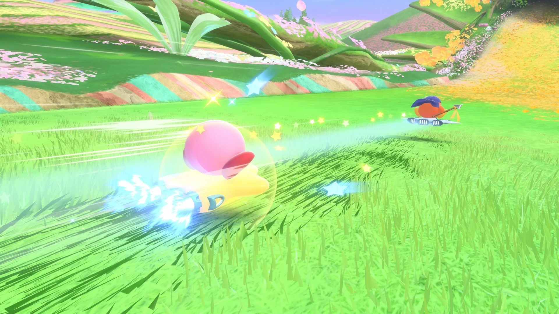 On est sur un joli jeu à regarder, mais qui ne va pas décrocher la mâchoire des plus exigeants des gamers. Le jeu est pourtant très mignon, vraiment coloré, joli à regarder et surtout techniquement irréprochable. On sait que le créateur de Super Smash Bros. est un exigeant et un forcené du travail. Il a donc tout fait pour que ce Kirby Air Riders soit techniquement proche de la perfection au niveau technique. Une fois le jeu lancé en solo, on est toujours proche d'une soixantaine d'images par seconde stable, ce qui est excellent quand on sait tout ce qu'il se passe à l'écran. La direction artistique globale est excellente et chaque niveau dégage quelque chose de particulier grâce à un design exquis. On reste surtout très surpris de la variété de l'ensemble des courses proposées et certaines sortent vraiment du lot comme Crevasse cristalline qui nous envoie des couleurs plein les mirettes.